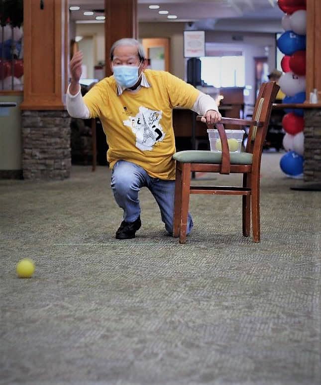 One of the highlights of living at an All Seniors Care Living Centre is our annual ASC Games. The Games begin in February, but Spirit Week is coming up quickly! Taking place from Monday January 24th – 28th, Spirit Week aims to get everyone excited for the ASC Games. One of the highlights of the year, events this January include:Asian senior man in mask kneeling and throwing a ball