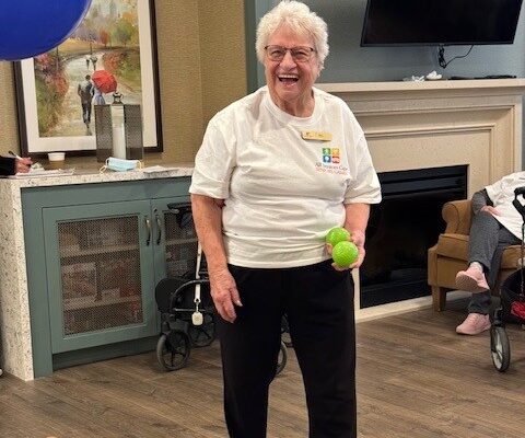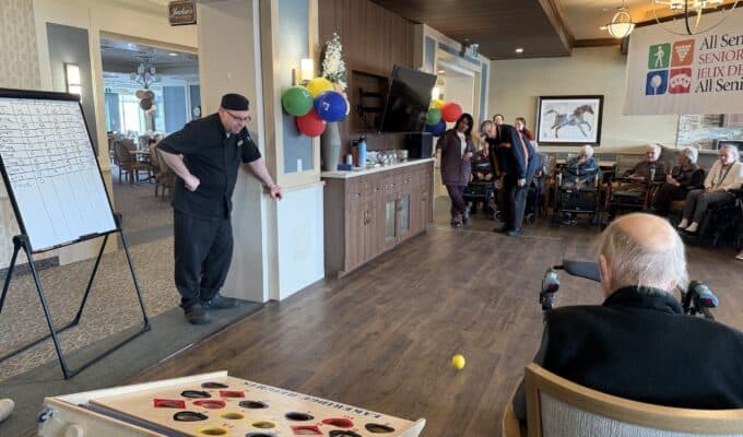 Elaine T. was hesitant to play bean bag toss, claiming she couldn’t aim well, but with some encouragement from her peers and staff, she ended up in the final 4!