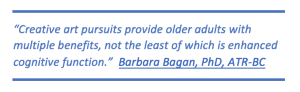 According to scientists, visual arts help seniors with cognitive decline because it can involve: planning, making decisions related to the piece, thinking outside the box, talking about the artwork, relationship building, reflection on past experiences, and coming to resolutions. Together, these contribute to cognitive stimulation.