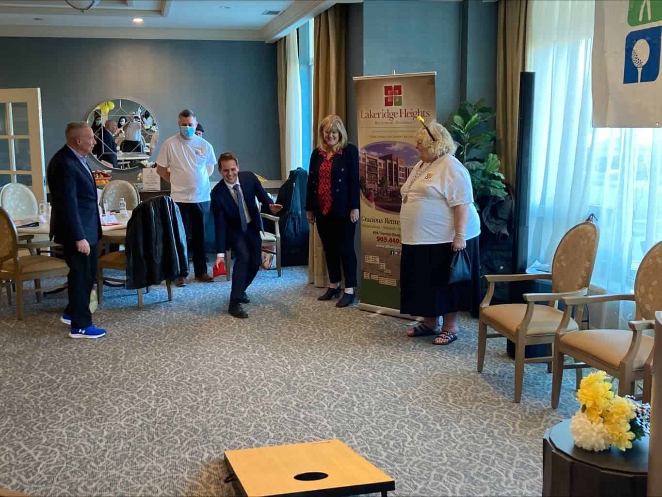 Cataraqui Heights was buzzing for Day 1 of the Senior Games! It was a sea of white with everyone in their ASCSG T-Shirts as they filled the dining room for our Opening Ceremonies. Joined by City Councillor Paul Chaves, our Chef de Mission Opened the Games and our halls filled with residents walking all floors. We were then joined by Barrack, the Mascot for the Kingston Frontenacs and their players followed. The Bistro and Games room filled with residents showing off their Bean Bag Toss and Billiards skills, along with the Frontenacs taking their turn with Laddergolf.