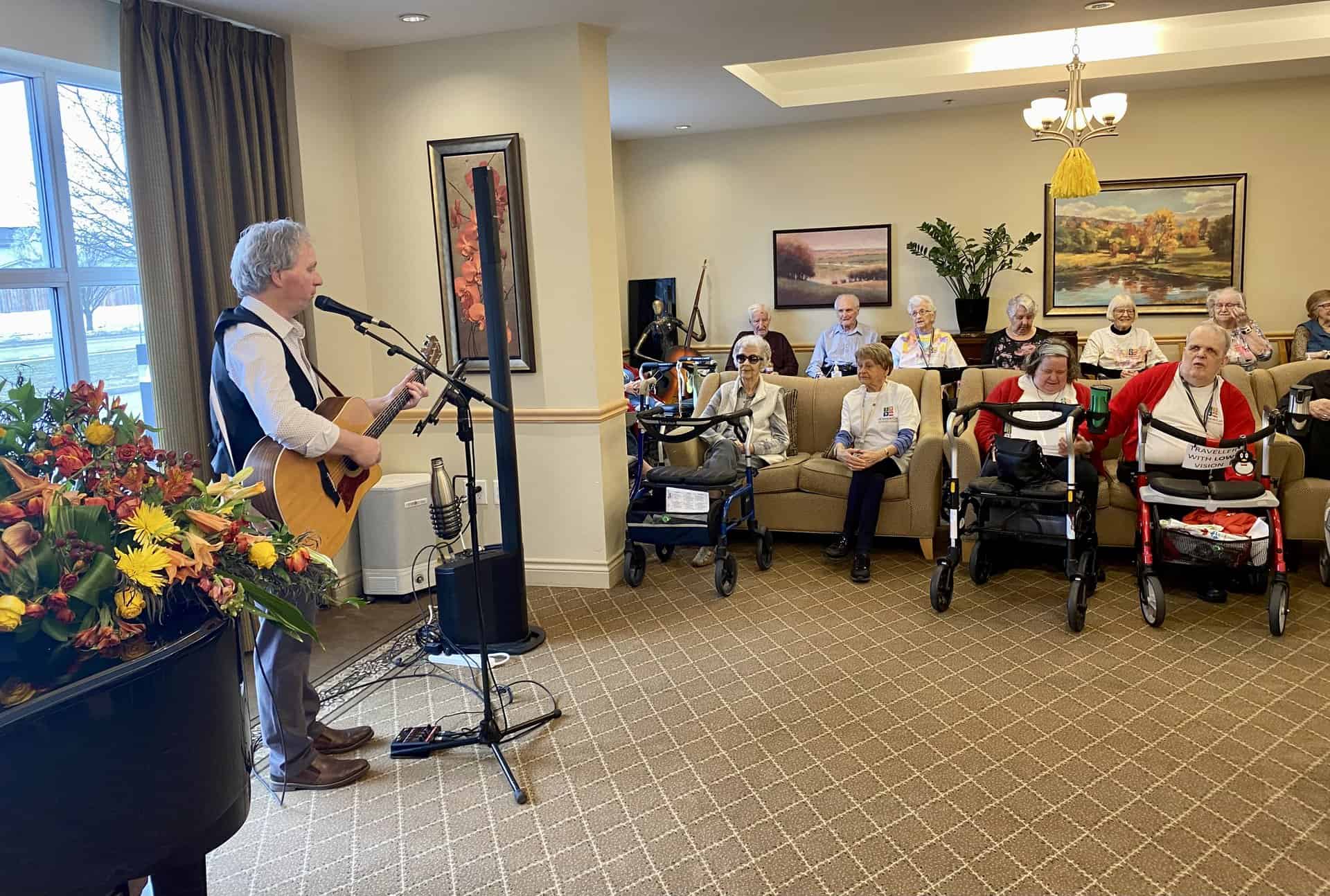 City Councillor for Ward 6, Richard Pootmans, demonstrated the bean bag toss game. Our residents enjoyed his company and many inspiring conversations were had. Community Liaison Suzy Trottier circulated the room and watched the ceremonies. The day ended with Walk the Halls with approximately 35 residents participating. One group just kept going well past closing as they continued their stride and sang to Elvis playing on the PA system!